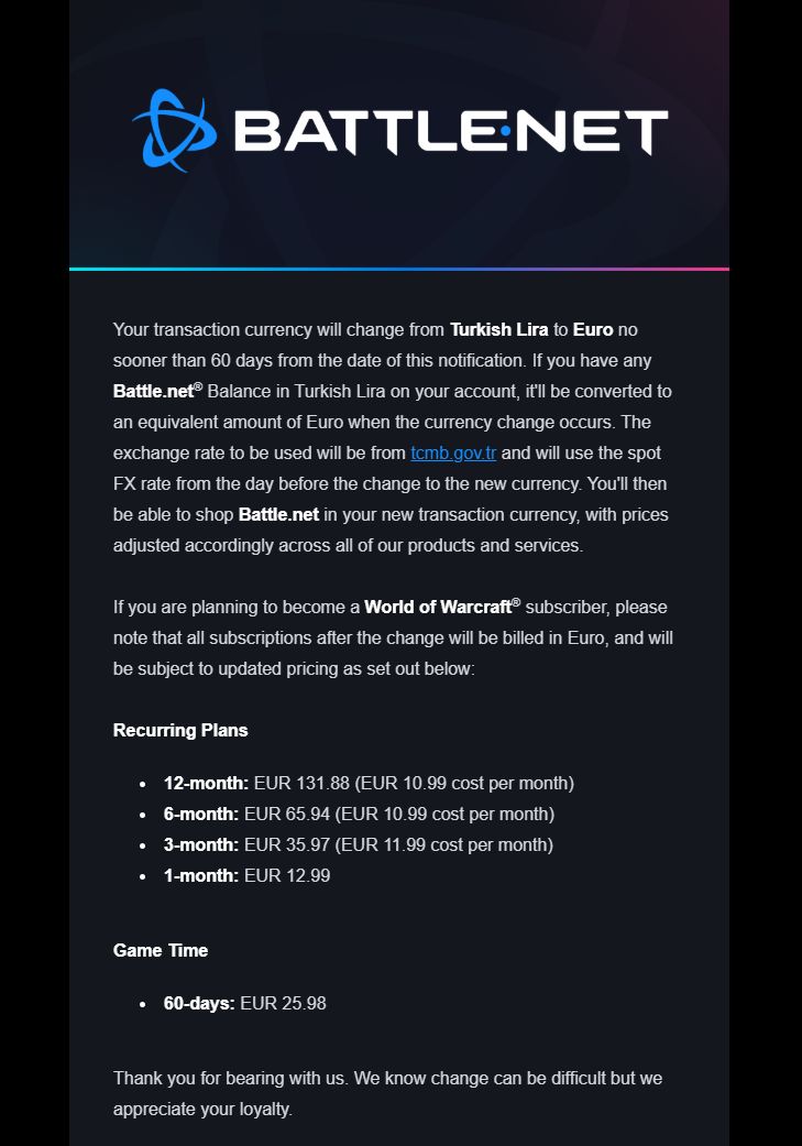 Bu para birimi değişikliğinden en sert etkilenecek grubun World of Warcraft (WoW) oyuncuları olması bekleniyor. Yıllardır yerel fiyatlandırma avantajıyla uygun fiyatlara aboneliklerini yenileyen Türk oyuncular, artık Avrupa standartlarındaki tarifelerle karşı karşıya kalacak. Mevcut durumda 12 aylık bir abonelik planı yaklaşık 3 bin 600 TL seviyelerindeyken, yeni euro bazlı fiyatlandırma ile bu rakamın güncel kurla 7 bin TL sınırına dayanacağı öngörülüyor. Blizzard tarafından açıklanan resmi euro tarifesi şu şekilde sıralanıyor: