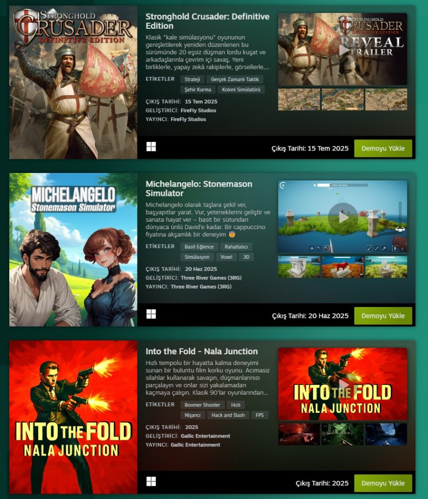 Demosu yayınlanan oyunlar arasında çok çeşitli türlerden yapımlar bulunuyor. Rol yapma oyunlarından stratejiye, simülasyonlardan aksiyona kadar geniş bir yelpazeye yayılan demolar, Steam mağazasında kullanıcıların listelerini güncellemeleri için büyük bir fırsat sunuyor. Oyuncular, oynadıkları demolar sayesinde gelecek indirim dönemlerinde hangi oyunları satın alacaklarını daha net belirleyebiliyor.